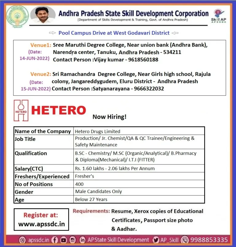 Hetero Drugs Ltd Walk In Interview 2022 : B.Pharm, B.Sc, M.Sc, ITI, Diploma for Trainee / Production Chemist / Technician At Tanuku & Eluru . Hetero Drugs Ltd Notification full details below.Intrested and eligible candidates can attend Interview on scheduled time and venue.