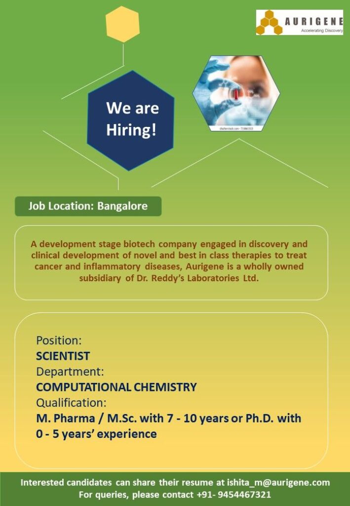 Aurigene is looking to recruit highly passionate Scientists in Computational Chemistry at Bangalore (Electronics City). For detailed Job Description, please click on the link given below!