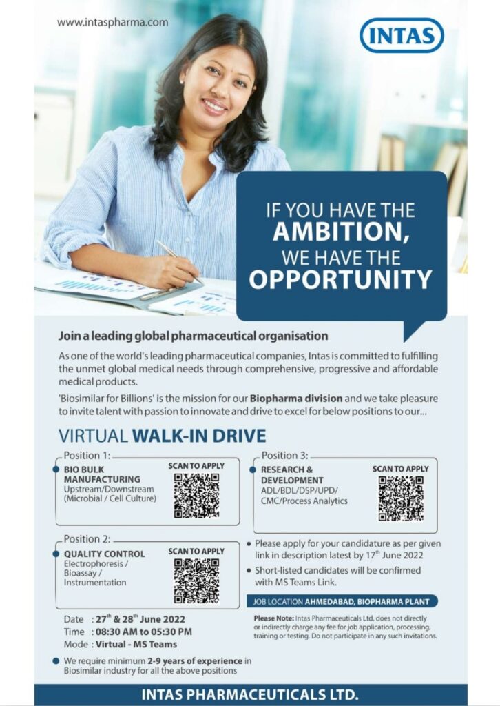 Intas is expanding and evolving its Biopharmaceutical capabilities. We invite ambitious professionals to be a part of its future growth story Interested & Eligible Candidates are requested to click the below-given links to apply for respective positions latest by 17 June 2022.