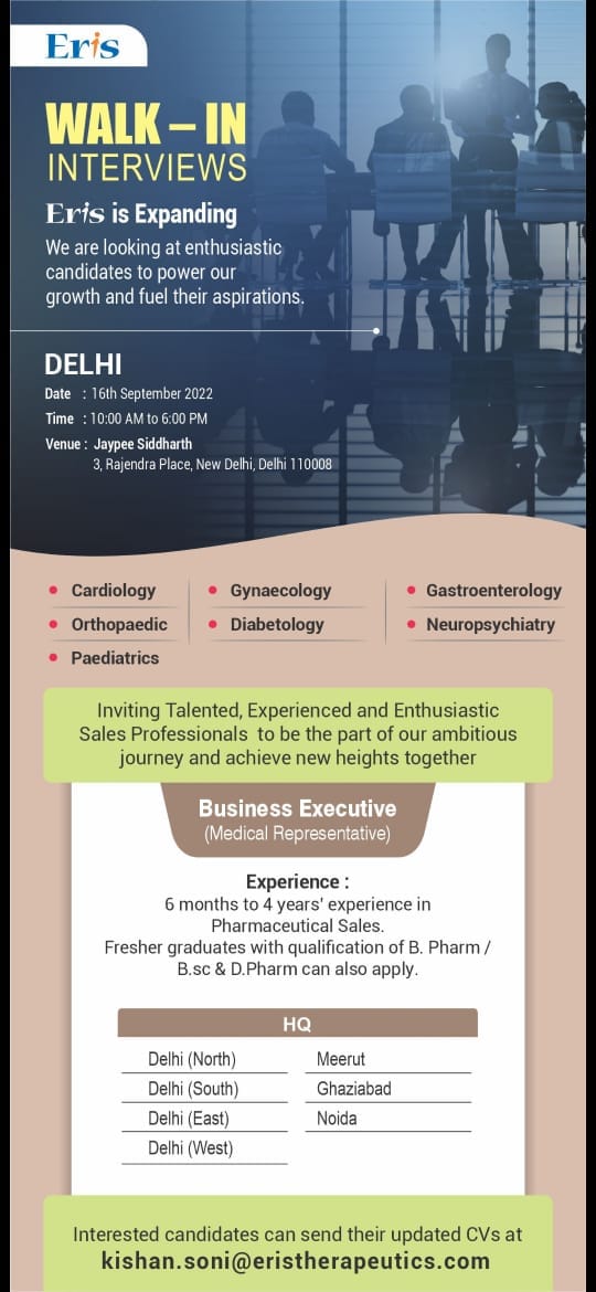 Eris Lifesciences Limited Walk-in Interview 2022 .Eris Lifesciences Limited Notification full details below.Interested and eligible candidates can attend interview on scheduled time and venue.Eris Lifesciences Limited is a leading Indian branded formulations company with a strong presence in chronic and lifestyle therapies such as anti-diabetes, cardiology, nutrition and neuropsychiatry. Since its inception in 2007, Eris has demonstrated robust growth and is now ranked among the Top-20 Indian companies in the domestic branded pharmaceuticals market.