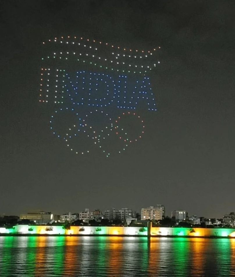 An awesome drone show at Sabarmati riverfront on the eve of 36th National Games. It welcomed Prime Minister Narendra Modi, drew the national flag, portrait of Sardar Patel and logo of the games, among other things… pic.twitter.com/XPZKtJkndU— Amit Malviya (@amitmalviya) September 29, 2022