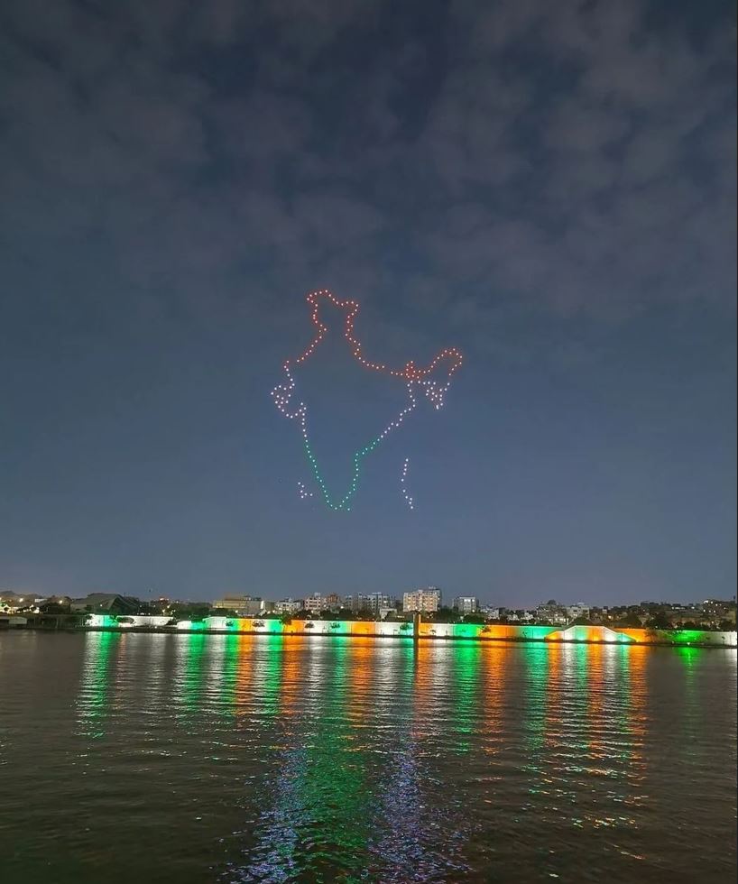 Replicas like Statue of Unity, Welcome PM Modi, Map of India, Vande Gujarat, Azadi Ka Amrit Mahotsav and National Games logo were created by drones flown in the sky above the riverfront. The drone show was organized above the eastern end of the Atal Bridge on the Sabarmati riverfront. A large number of people were also present to watch this drone show. The drone show was inaugurated by Minister of State for Sports and Home Affairs Harsh Sanghvi.