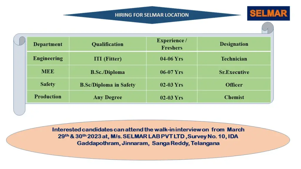 Selmar Lab Pvt. Ltd is a pharmaceutical company involved in manufacturer of Bulk Drug Intermediates and Active Pharma Ingredients (API). Selmar Lab Pvt. Ltd ., a Leading Bulk Drug Manufacturer certified by An ISO 9001:2015, looking for suitable Applicants with Bulk Drug Industry Experience at our Facilities.Selmar Lab Pvt. Ltd Walk In Interview 2023. Selmar Lab Pvt. Ltd Notification full details below..Interested and eligible candidates can attend interview on scheduled time and venue.