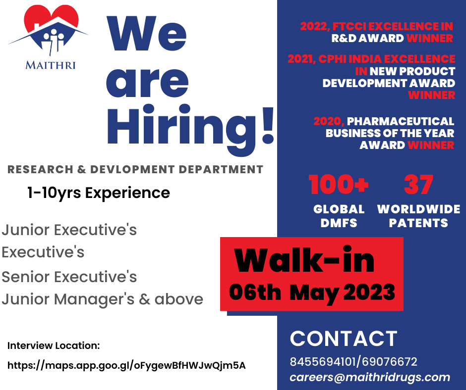 Maithri Drugs pvt Ltd Walk In Interview 2023.Maithri Drugs pvt Ltd Notification full details below..Interested and eligible candidates can attend interview on scheduled time and venue.Maithri Drugs Pvt. Ltd is one of India's fast-growing pharmaceutical companies. Maithri's strategic focus is on active pharma ingredients (APIs). The company is widely recognized for its excellent research & development and aggressive growth strategies. Maithri Drugs Pvt. Ltd (MSN group) is a generic pharmaceutical API manufacturing company based at Hyderabad.