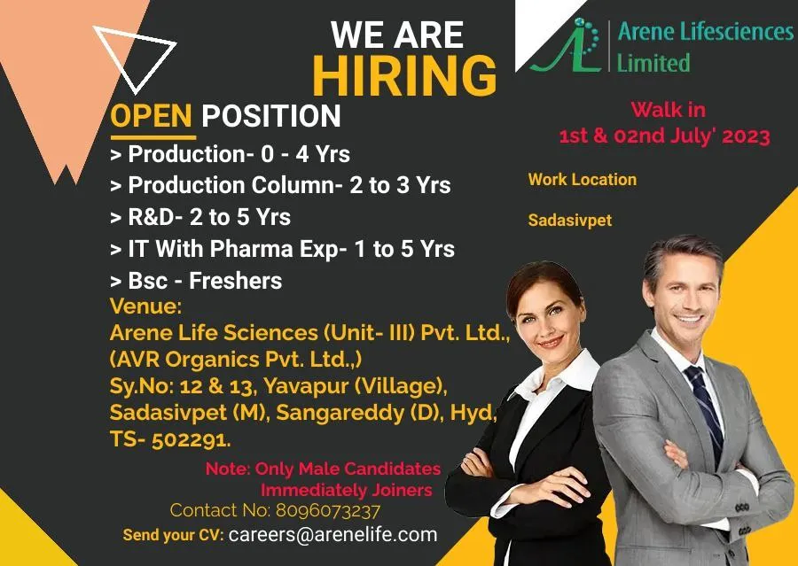 Arene Lifesciences Limited Walk-in Interview 2023.Arene Lifesciences Limited Notification full detailes below.Interested and eligible candidates can attend interview on scheduled time and venue.Arene Lifesciences Limited, one of the Quality conscious Active Pharmaceutical Ingredients Manufacturer having state of the art Manufacturing Facilities with WHO-GMP approvals and Certificate of Suitability for the APIs.