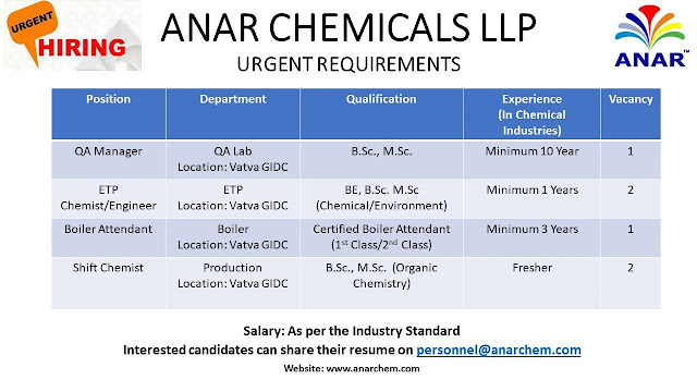 Salary: As per the Industry Standard Interested candidates can share their resume on personnel@anarchem.com