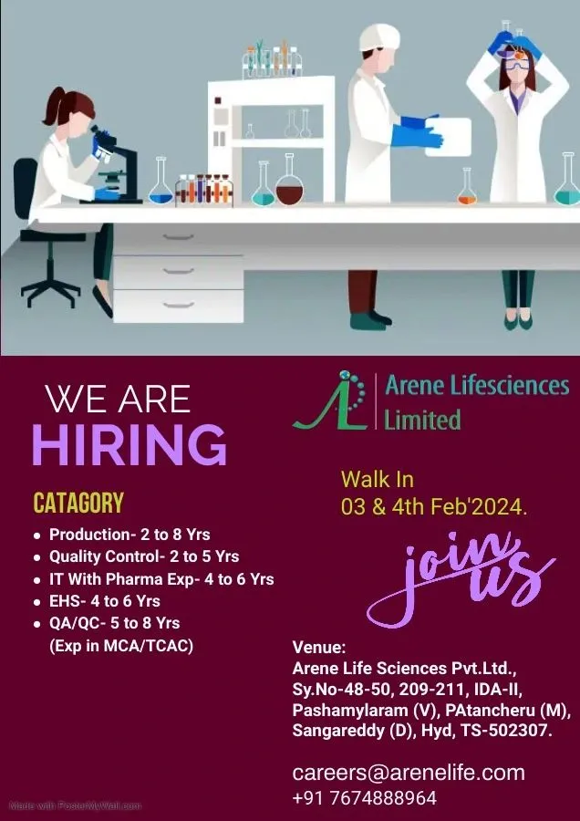 Arene Lifesciences Limited Walk-in Interview 2024.Arene Lifesciences Limited Notification full detailes below.Interested and eligible candidates can attend interview on scheduled time and venue.Arene Lifesciences Limited, one of the Quality conscious Active Pharmaceutical Ingredients Manufacturer having state of the art Manufacturing Facilities with WHO-GMP approvals and Certificate of Suitability for the APIs.