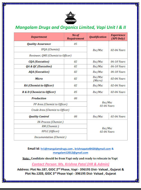 Job Description: Greeting from Mangalam Drugs and Organics Limited !!!!!!