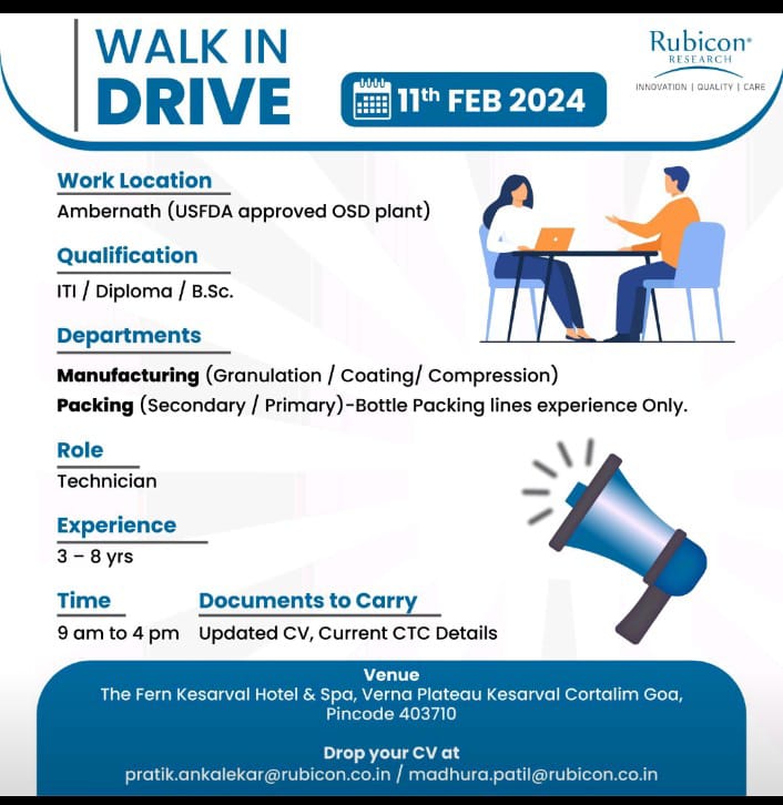 Rubicon Research Pvt. Ltd Walk-in Interview 2024. Rubicon Research Pvt. Ltd Notification full details below.Interested and eligible candidates can attend interview on scheduled time and venue.Rubicon Research is an IP led, specialty pharmaceutical company focused on our mission to provide innovative yet affordable patient-centered products and solutions so as to address unmet needs around the world. We leverage our proprietary technologies and specialized formulation development skills to provide solutions to complex delivery challenges; enabling better patient outcomes.